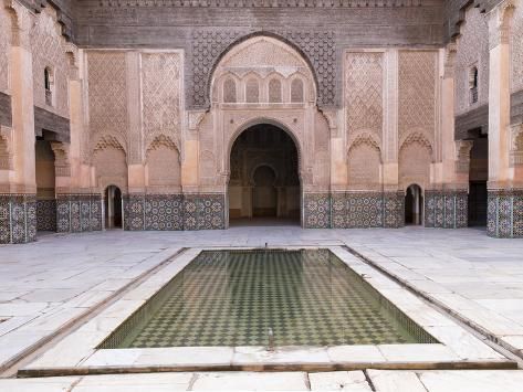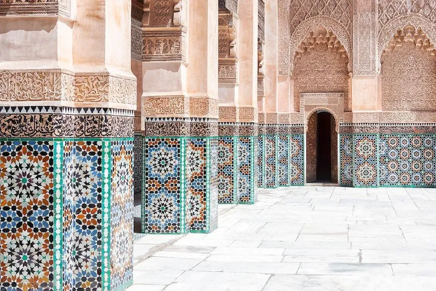 Un joyau de l’architecture mauresque, fondée par Abu Al-Hasan, sultan mérinide. La structure actuelle de cette école coranique fut édifiée vers 1570 par les saâdiens et restaurée en 1950. C’est l’œuvre du sultan saadien Abdallah El-Ghalib qui en acheva la construction en 1565. Le nom Ben Youssef vient du sultan almoravide Ali Ben Youssef. La Médersa, fut durant plus de 4 siècles un foyer d’accueil pour les étudiants en soif de connaissances dans diverses sciences, notamment en théologie. Elle disposait de 132 chambres destinées aux étudiants non originaires de Marrakech et pouvait accueillir jusqu’à 900 étudiants. À l’opposé de la porte d’entrée, de l’autre côté du bassin rectangulaire, s’ouvre la salle de prières constituée de trois nefs délimitées par des piliers de marbre supportant des arcs aux façades ciselées de motifs d’ornementation. La nef centrale donne sur une petite salle en demi-cercle dont l’ouverture est somptueusement décorée de motifs floraux et géométriques.