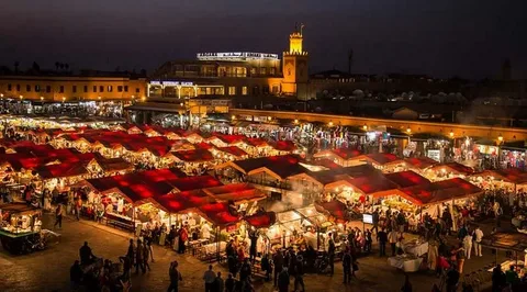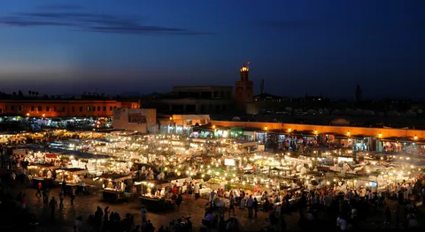 C’est une célèbre place publique à Marrakech. Ce haut-lieu traditionnel, populaire et animé notamment la nuit attire plus d’un million de visiteurs chaque année. cet espace culturel est inscrit patrimoine mondial depuis 1985 par l’Unesco. Au 12ème siècle, la place Jemaa el-Fna était un lieu de justice où les peines étaient publiquement appliquées. Dès la seconde moitié du 16ème siècle, les activités et fonctions de la place ont évolué, comme un lieu cosmopolite où règne une forte activité commerciale. Véritable Cour des Miracles, aux portes des souks de Marrakech, proche de la mosquée Koutoubia et du palais royal, cette place est une des principales attractions traditionnelles et historiques du tourisme au Maroc. Elle est animée d’une importante vie populaire de la fin de l’après midi jusqu’à l’appel à la prière à l’aube. En effet, en journée de nombreux forains, camelots et artistes de rue sont présents (cracheurs de feu, tatoueuses au henné, montreurs de singes, charmeurs de serpents, diseuses de bonne aventure, etc.), tandis que la nuit, c’est notamment des stands de restauration qui sont présents.